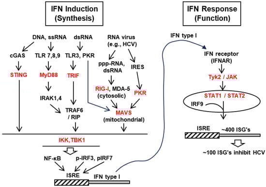 Selected members of the IFN induction and response pathways. The various abbreviations and the signaling of the pathways have been described in detail in the text (Section 2). The cascade pathways, triggered by diverse pathogenic nucleic acids (e.g., HCV RNA), and the downstream molecules are indicated. The targets of HCV (Section 3) are shown in red color.