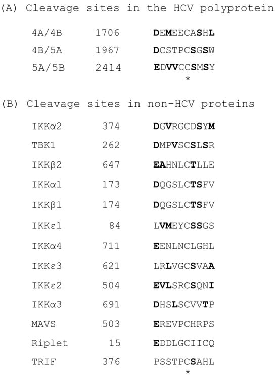 - Li, K.; Foy, E.; Ferreon, J.C.; Nakamura, M.; Ferreon, A.C.; Ikeda, M.; Ray, S.C.; Gale, M., Jr.; Lemon, S.M. Immune evasion by hepatitis C virus NS3/4A protease-mediated cleavage of the Toll-like receptor 3 adaptor protein TRIF. Proc. Natl. Acad. Sci. USA 2005, 102, 2992–2997. [Google Scholar] [CrossRef]