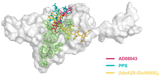 The binding molecular model of oligosaccharides of the HS-analogue and SARS-CoV-2 RBD. The green surface indicates the RBD-ACE2-RBD binding interface. AD08043 is colored in purple, PPS is colored in teal, and (IdoA2S-GlcNS6S)4 is colored in yellow.