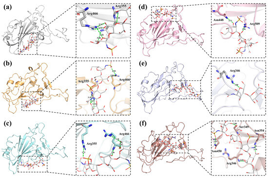 Furthermore, the binding affinity of AD08043 with the RBD of several SARS-CoV-2 variants was also analyzed (Table S2). The results demonstrated a high-affinity binding of AD08043 to the RBD of SARS-CoV-2 variants (Table 3). During the interaction with AD08043, the SARS-CoV-2 B.1.1.7 (alpha) variant’s RBD shows six hydrogen bonds with the binding interface amino acid residues of Arg355 (3.18 Å, 3.33 Å, and 3.23 Å) and Arg466 (2.84 Å and 2.95 Å) as well as nine hydrophobic contacts. The SARS-CoV-2 B.1.351 (beta) variant’s RBD shows six hydrogen bonds with the binding interface amino acid residues Arg355 (3.22 Å) and Arg466 (3.28 Å and 3.06 Å), as well as seven hydrophobic contacts. The SARS-CoV-2 P.1(gamma) variant’s RBD shows two hydrogen bonds with the binding interface amino acid residues Asn448 (2.73 Å) and Arg509 (2.96 Å), as well as eleven hydrophobic contacts with the binding interface amino acid residues Arg346, Asn450, and Tyr451. The SARS-CoV-2 B.1.617.2 (delta) variant’s RBD shows six hydrogen bonds with the binding interface amino acid residues Arg346 (2.80 Å) as well as nine hydrophobic contacts with the binding interface amino acid residues Ala348, Ala352, Asn354, and Tyr451. The SARS-CoV-2 B.1.1.529 (omicron BA.1) variant’s RBD shows six hydrogen bonds with the binding interface amino acid residues Arg346 (2.81 Å), Ser349 (3.06 Å), Asn354 (2.96 Å), and Asn450 (3.01 Å), as well as eight hydrophobic contacts with the binding interface amino acid residues Phe347, Ala348, and Ala352. Exceptionally, the B.1.351 (beta) variant’s RBD has shorter hydrogen bond lengths and more hydrophobic contacts. It should be pointed out that the interactions between AD08043 and the RBDs of the different variants of SARS-CoV-2 are located around the interface of the RBD-ACE2 (Figure 5). To provide a more comprehensive analysis, we further analyzed the binding affinity and intermolecular interactions of the top ten pentasaccharides with the RBD. The results demonstrated that the other pentasaccharides bind with a slightly lower affinity than AD08043. Additionally, the top ten pentasaccharides all bind to the RBD at the RBD-HS-ACE2 binding interface, demonstrating a comparable binding pattern with the AD08043-RBD complex (Figure S1 and Table S3).
