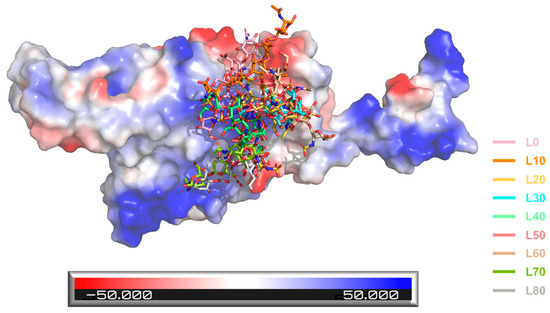Electrostatic surface rendering of the SARS-CoV-2 RBD-AD08043 complex during the MD simulation. Blue and red surfaces indicate electropositive and electronegative surfaces, respectively. L0, L10, L20, L30, L40, L50, L60, L70, and L80 are colored in pink, orange, yellow, cyan, pale green, salmon, wheat, limon, and gray (e.g., L10 represents the location of AD08043 at 10 ns during the MD simulation period).