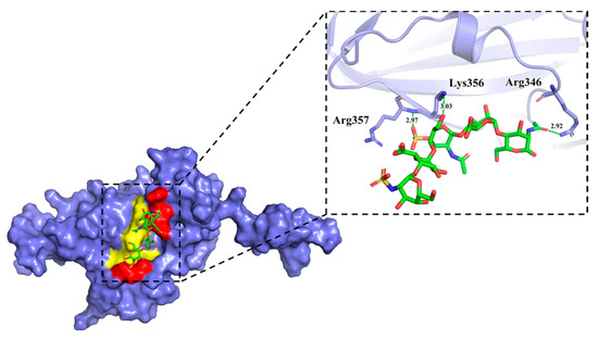 Next, we analyzed binding affinity of the selected pentasaccharide AD08043 with RBD in comparison with other oligosaccharides that have shown a binding to RBD (Figure 3), including the pentosan polysulfate monomer (PPS) [20,21] and (IdoA2S-GlcNS6S)4 [6] via the molecular docking of SARS-CoV-2 RBD (Table 1). The results indicate that AD08043 binds more tightly with SARS-CoV-2 RBD (with a binding energy of −7.149 kcal/mol) than (IdoA2S-GlcNS6S)4 and PPS (with binding energies of −6.797 and −6.247 kcal/mol, respectively).