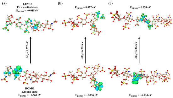 The FMOs including HOMO and LUMO for (a) AD08043; (b) PPS; and (c) (IdoA2S-GlcNS6S)4, as calculated at B3LYP-D3/6-31 + G(d,p) level of DFT.