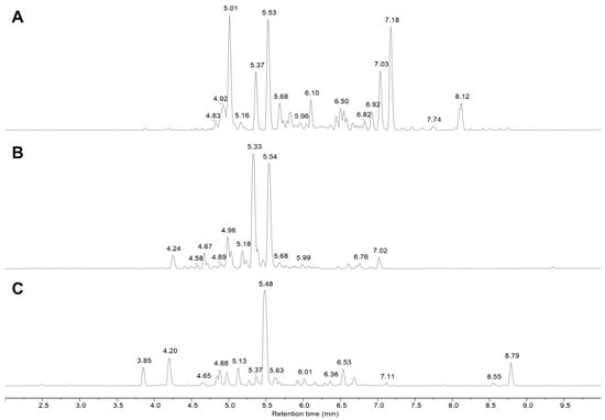 Figure 1 reports the UPLC–HRMS base peak chromatograms of fractions B obtained from Cinnamomum cassia buds (BCHE, Figure 1A) and bark (CCHE, Figure 1B) and Cinnamomum zeylanicum (CZHE, Figure 1C) extracts, showing significant differences among the chemical compositions of the three samples.
