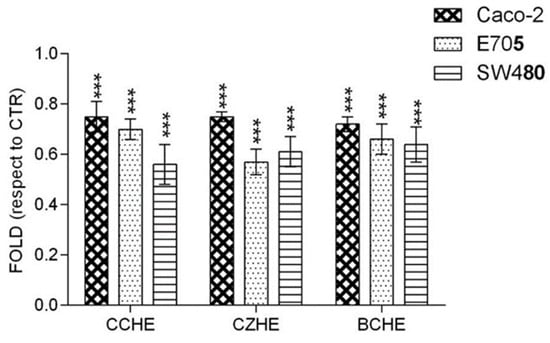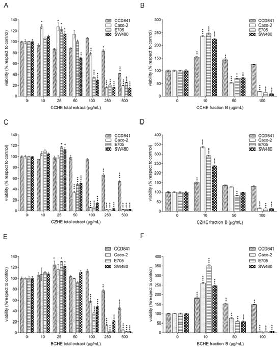 MTT assays (Figure 2) revealed opposite biological effects of total extracts and fractions enriched in polyphenols at different doses. In particular, we observed a beneficial effect at low doses and a toxic effect at high doses: this phenomenon has been described using the term of hormesis []. The stimulatory effect was observed for CCHE total extract at 10 μg/mL on Caco-2 cells and 25 μg/mL on Caco-2, E705, and SW480 cells (Figure 2A), for CZHE total extract at 25 μg/mL on E705 and SW480 cells (Figure 2C), and for BCHE total extract at 25 μg/mL on CCD841, E705, and SW480 cells (Figure 2E).