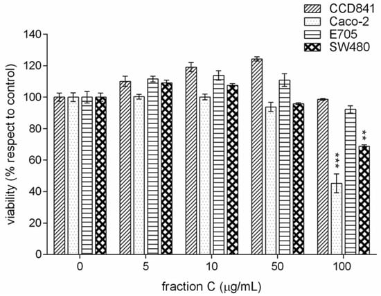 MTT viability assay on healthy colorectal mucosa CCD841 cell line and colorectal cancer cell lines Caco-2, E705, and SW480. The cells were treated for 48 h with fraction C enriched in cinnamaldehyde at concentrations between 0 and 100 μg/mL. Statistical significance: ** p < 0.01, *** p < 0.001 (Dunnett’s Test).