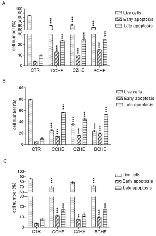A stronger effect of all three fractions was observed on E705 cells, where the late apoptotic cells are 56%, 44%, and 52% after treatment with CCHE fraction B, CZHE fraction B, and CCHE fraction B, respectively (Figure 5B and Supplementary Material—Figure S7). As reported in Figure 5C and Supplementary Material—Figure S8, the treatment with fractions B from all hydroalcoholic extracts was less effective in inducing apoptosis in SW480 than in other cell lines.