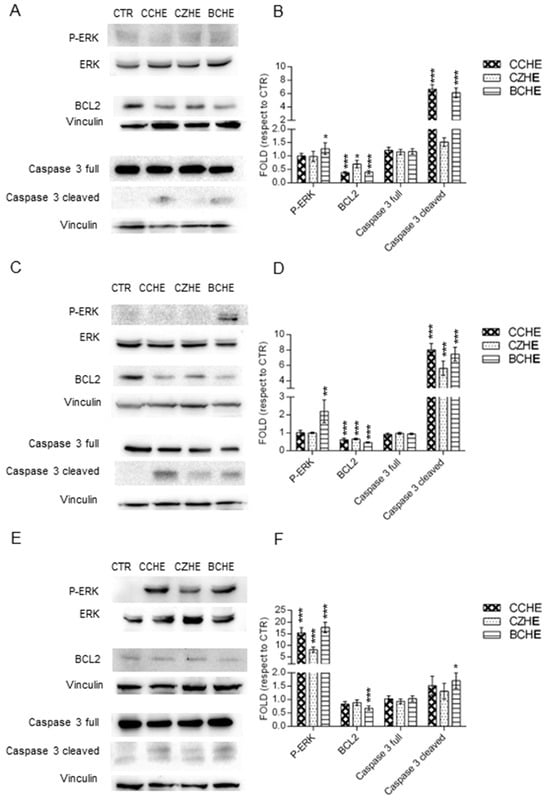 Western blot analyses showed different molecular mechanisms of apoptosis. In Caco-2 cells, only the treatment with BCHE fraction B induced a weak ERK activation. CCHE and BCHE fractions B induced a decrease in anti-apoptotic BCL2 factor and caspase 3 cleavage and activation (Figure 6A).