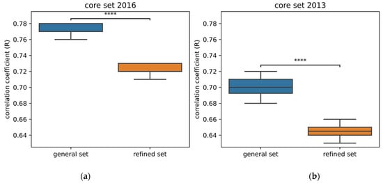 Comparison of the performance of Pafnucy [10] after being trained on the general or the refined set of PDBbind 2019. Ten models were trained on each dataset. (a) Performance is evaluated on the core set 2016; (b) performance is evaluated on the core set 2013. For both core sets, performance by training on the general set significantly outperforms the performance by training on the refined set. The following p-values correspond to the annotations on the plots: ****: p ≤ 1.00 × 10−4.