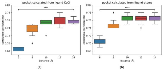 Comparison of the performance of models trained with different sizes and types of pockets. For each size, 10 models were trained and tested on the core set 2016. (a) Models trained with pockets made of residues located within a specific distance from the center of geometry of the ligands; (b) models trained with pockets created with residues located within a specific distance from all atoms of the ligands. The following p-values correspond to the annotations on the plots: ****: p ≤ 1.00 × 10−4, and ♦ are possible outliers.