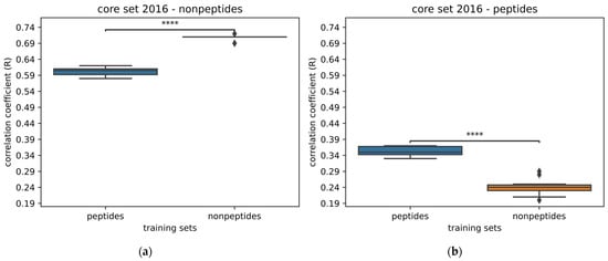 Comparison of the performance of models trained with protein–peptide complexes and with protein–nonpeptide complexes. Models were trained with Pafnucy on 2383 complexes and validated on 492 complexes. (a) Performance evaluated on 266 complexes with nonpeptides from the core set 2016; (b) performance evaluated on 19 complexes with peptides from the core set 2016. The following p-values correspond to the annotations on the plots: ****: p ≤ 1.00 × 10−4, and ♦ are possible outliers.