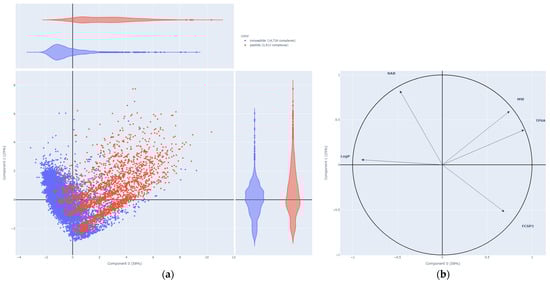 Principal component analysis applied on the ligands of the PDBbind dataset. Peptides are colored in red, while the rest of the ligands are displayed in blue. (a) Plot of the individuals; (b) correlation circle.
