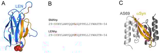 The C-C′ β-hairpin in the light chain variable domain and β-hairpin binding caused by β-wrapins. (A) Structure of the LEN VL domain (pdb:1LVE) []. The C-C′ β-hairpin is highlighted in orange, apart from the sites that differ between SMA and LEN, which are shown in red. Residue P40 in the turn of the C-C′ β-hairpin is displayed as red spheres. (B) Sequences of hairpin peptides investigated in this study, with differences between SMAhp and LENhp highlighted in red. Amino acid residue 40 regulating amyloid formation is printed in bold. (C) Structure of β-wrapin AS69 (the two subunits displayed in light gray and dark gray) in complex with the β-hairpin formed by αSyn (orange) (pdb:4BXL) []. AS69 binds β-hairpins in the same way as AS10 does [,].