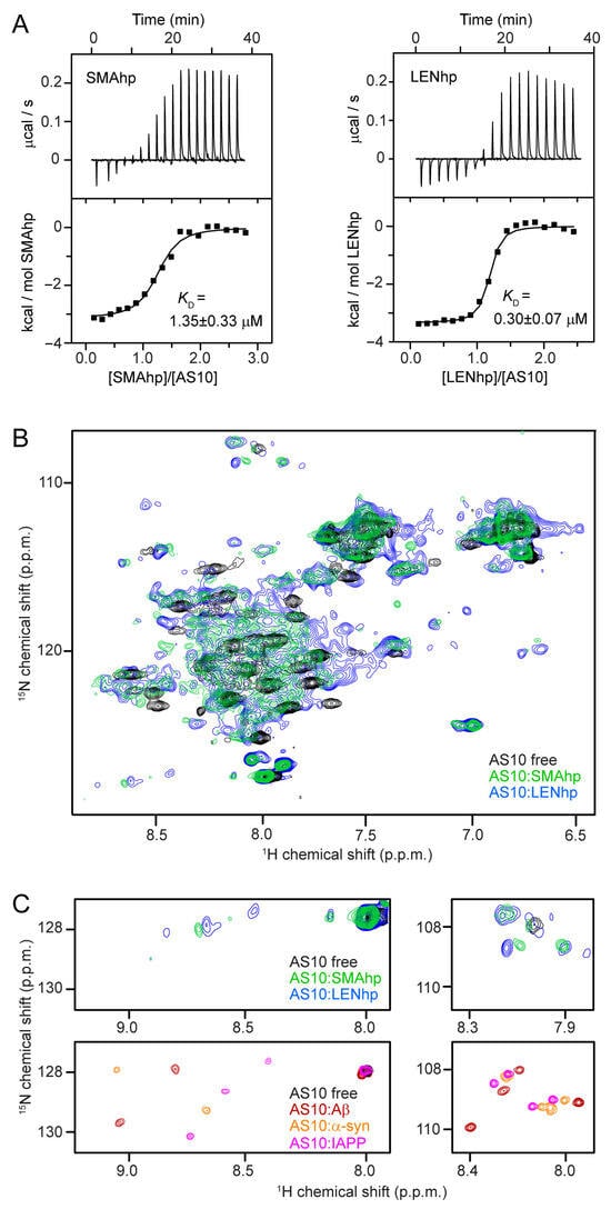 In isothermal titration calorimetry (ITC), the titration of SMAhp or LENhp into AS10 solutions demonstrated 1:1 binding with dissociation constants of 1.35 ± 0.33 µM or 0.30 ± 0.07 µM, respectively (Figure 2A). These affinities for AS10 are in the same range as those of αSyn (KD = 0.38 µM), Aβ (KD = 0.15 µM), and IAPP (KD = 0.91 µM) []. The 4.5-fold higher affinity of LENhp can be explained by the presence of proline residue P40, which is expected to support turn and β-hairpin formation. For both SMAhp and LENhp, endothermic post-transition heat signals were observed, indicating that dilution of the concentrated peptide solutions (c ≈ 0.6 mM) into the ITC cell leads to heat consumption. A plausible explanation is that the peptides form assemblies at high concentrations that (partially) disassemble upon dilution, which would result in the detection of heat from the disassembly reaction.