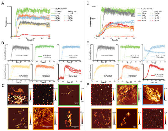 Modulation of αSyn aggregation by SMAhp (left) and LENhp (right) in ThT assay under quiescent conditions. Buffer, 30 mM Tris-HCl, pH 7.4, with indicated salt concentration. ThT time course and AFM images of 25 µM αSyn in the absence (gray) and presence of SMAhp (A–C) or LENhp (D–F). Frames around the AFM images correspond to the frames in the kinetics diagrams for indication of the sample; the same color coding for SMAhp and LENhp concentrations as in the kinetic diagrams was used for the AFM image frames.