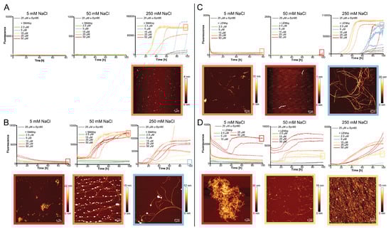 AFM imaging of the endpoints of the ThT assays frequently detected fibrils but also amorphous material (Figure 4). An increase in the concentrations of the hairpin peptides correlated with reduced fibril length and the appearance of clusters with an amorphous appearance, which were often associated with fibrillar structures (Figure 4; frames around the AFM images are color-coded according to the hairpin peptide concentration from 2.5 to 50 µM in the following order: green, blue, yellow, orange, and red). Amorphous clusters were observed particularly at hairpin peptide concentrations ≥ 25 µM (Figure 4, AFM images in orange or red frames). This concentration dependence of the transition from a fibrillar to apparently amorphous morphology is similar to the one observed in the agitation assay (Figure 3C,F).