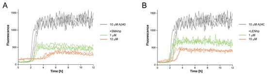 To test if the modulating effects of SMAhp and LENhp on protein aggregation were specific to αSyn, we finally studied the kinetics of Aβ40 aggregation in an agitation assay. The addition of stoichiometric amounts of SMAhp or LENhp to 10 µM of Aβ40 resulted in a prolonged lag time (Figure 6A,B). In contrast to αSyn, a reduction in the lag time at low concentrations of SMAhp or LENhp was not discernable. This suggests that these β-hairpin peptides have a general capacity to cross-interact with heterologous amyloid-forming proteins. However, the current data do not reveal if the same mechanistic basis applies to the modulation of αSyn and Aβ40 aggregation.