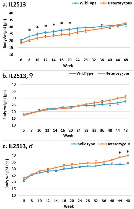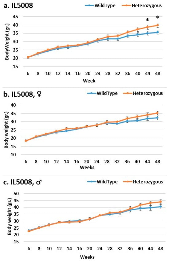 Body weight changes in wild-type and Smad4+/− mice at 14 time points for line IL5008 (6–48 weeks old). The X-axis depicts time points (in weeks), while the Y-axis depicts body weight values. In this line, mutant mice weigh more than control mice in all three groups ((c) males, (b) females, and (a) overall); however, the weight difference grew during the experiment and was only significant in the overall group at weeks 44 and 48. * shows a significant variation between the two lines (values) at the specific time point.
