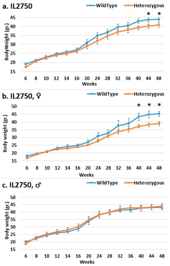 Body weight changes in wild-type and Smad4+/− mice at 14 time points for line IL2750 (6–48 weeks old). The X-axis depicts time points (in weeks), while the Y-axis depicts body weight values. From week 20 until the end of the experiment, one may observe a difference in the weight of mutant mice compared to that of control mice in both the overall (a) and female groups (b). Only from week 40 is a significant difference demonstrated. There is no difference in the male group (c). * Shows a significant variation between the two lines (values) at the specific time point.