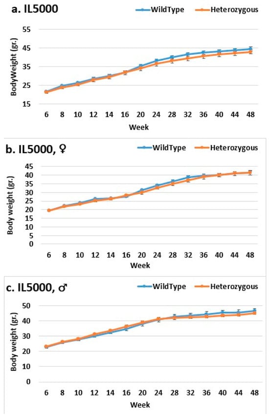 In the overall and female groups, the control mice weighed significantly more than the mutant mice in line IL2750 (Figure 2). Even at the end of the experiment, the control mice in the overall group beginning in week 44 and the female group beginning in week 40 weighed significantly more than the mutant mice. In the male group, there was no difference in BW. This could mean that females were more susceptible to the mutation and that it prevented them from gaining weight, just like control mice. In line IL5000, it was found that, in all groups, the control mice were heavier than the mutant mice after a few weeks (Figure 3). This occurred in females from weeks 28 to 48, in males from weeks 10–15 and 20–36, and in the overall group throughout the experiment, but with no statistical significance. In the male group of line IL3348, the control mice weighed more than the mutant mice from the start of the experiment until week 40, but there was no significant difference, and by weeks 44 and 48, their weight was nearly identical (Figure 4). The overall and female groups had a reversal point where the control mice weighed more than the mutation mice before reversing. This occurred at week 10 in the female group and week 20 in the overall group.