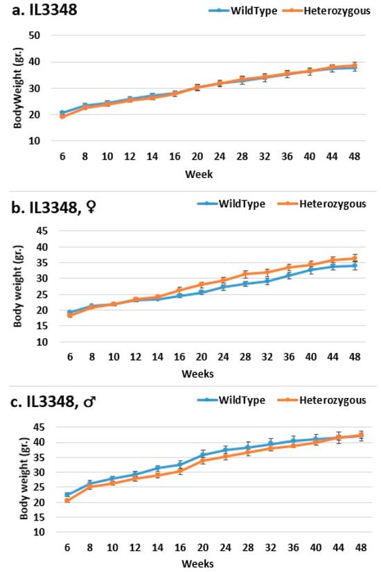 Body weight changes in wild-type and Smad4+/− mice at 14 time points for line IL3348 (6–48 weeks old). The X-axis depicts time points (in weeks), while the y-axis depicts body weight values. The mutant mice weighed about the same as the control mice throughout the experiment in the overall group (a). Nonetheless, when analyzed by gender, in the female group, the mutant mice weighed more than the control mice from around week 14 to the end of the experiment, but the difference was not statistically significant (b). In contrast, in the male group, the control mice weighed more than the mutant mice from the beginning of the experiment until week 40, but there was no significant difference, and by weeks 44 and 48, their weight was nearly identical (c).