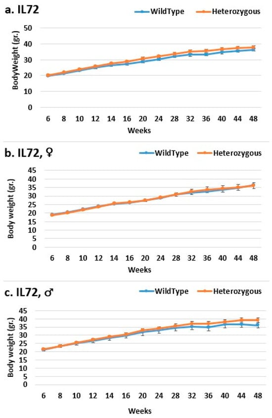 Body weight changes in wild-type and Smad4+/− mice at 14 time points for line IL72 (6–48 weeks old). The X-axis depicts time points (in weeks), while the Y-axis depicts body mass values in grams (g). We can see a difference in the weight of mice with heterozygous SMAD4 knockout compared to control mice in the male group from week 28 until the period’s conclusion, although it is not significant (c). In females (b) and the overall group (a), there is no difference in BW between mutant and wild-type mice.