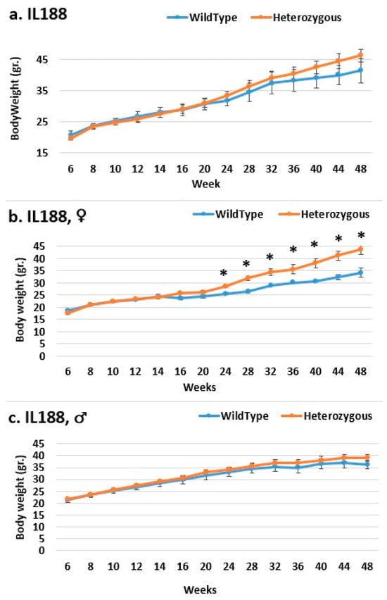 Body weight changes in the wild-type and Smad4+/− mice for line IL188 at 14time points (6–48 weeks old). The X-axis represents the time points (in weeks), while the Y-axis represents values of body mass. We can see a difference in the weight of mice with heterozygous SMAD4knockout compared to control mice in all groups (males (c), females (b), and overall (a)) from week 24 to the end of the period, although only the female group from week 24 shows a significant difference. * Shows a significant variation between the two lines (values) at the specific timepoint.