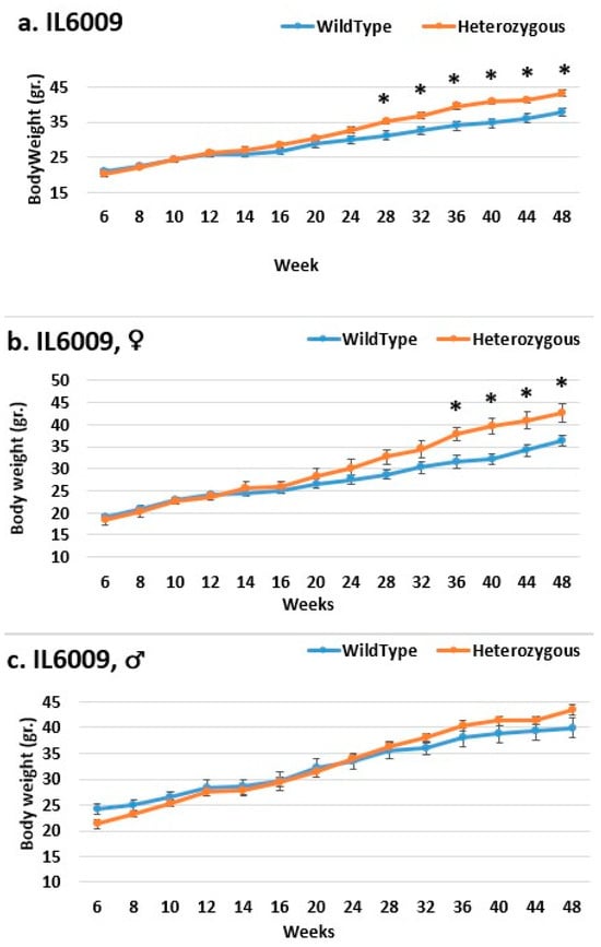Body weight changes in wild-type and Smad4+/− mice at 14 time points for line IL6009 (6–48 weeks old). The X-axis depicts time points (in weeks), while the Y-axis depicts body weight values. From week 14 through to the end of the period, one may observe a difference in the weight of mutant mice compared to that of control mice in both the (b) female and (a) overall groups. Only from week 28 is a significant difference in the overall group demonstrated, and, starting from week 36, a significant difference is demonstrated in the female group. In the male group (c), there was no significant change; until week 12, the control group weighed more than the mutant. From the start through to the end of the experiment, the mutant mice weighed more than the control mice, but the difference was not significant. * Shows a significant variation between the two lines (values) at the specific time point.