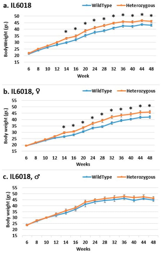 Body weight changes in wild-type and Smad4+/− mice at 14 time points for line IL6018 (6–48 weeks old). The X-axis depicts time points (in weeks), while the Y-axis depicts body weight values. One may see a substantial difference in the weight of mutant mice compared to that of control mice in both the (b) female and (a) overall groups from week 14 to the end of the experimental period. There is no difference between the (c) male groups. * Shows a significant variation between the two lines (values) at the specific time point.