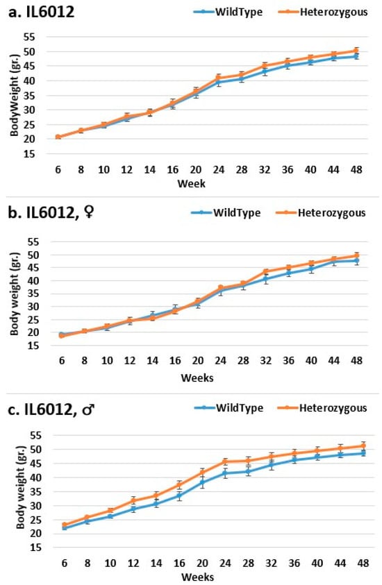 In line IL6009, from week 14 until the end of the experimental period, we observe a difference in the weight of mutant mice compared to that of control mice in both the female and overall groups. Only from week 28 is a significant difference demonstrated in the overall group, as well as from week 36 in the female group. In the male group, there was no significant difference until week 12; the control group weighed more than the mutant mice. From the start through to the end of the experiment, the mutant mice weighed more than the control mice, also without significance (Figure 8). In line IL6018, a significant difference in the weight of mutant mice compared to that of control mice in both the female and overall groups from week 14 to the end of the period was observed, but no difference was observed between the male groups (Figure 9). In contrast, the male group demonstrated a difference inline IL6012 throughout the experiment; the mutant mice were heavier than the control mice, but this difference was insignificant. In the female and overall groups throughout the experiment, the weight differences were negligible (Figure 10).