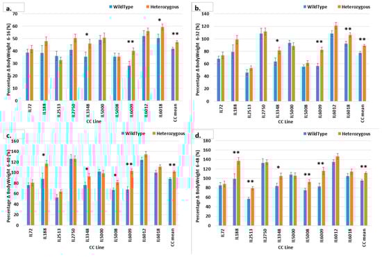 Percentage body weight gain (g) of ten different CC lines after 48 weeks of BW monitoring in the overall F1 population (males and females). (a) shows BW percentage gain in 10 different lines of F1 population with heterozygous SMAD4knockout vs. wild type until week 16; BW percentage gain until week 32 is shown in (b); (c) shows the percentage increase in BW until week 40, and (d) shows the percentage increase in BW until week 48. * Shows a significant variation at p < 0.05 between the two mutant and wild type (values), while ** p < 0.01.