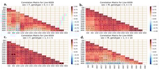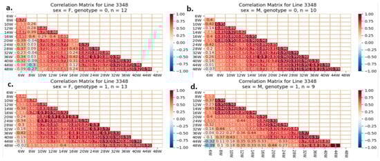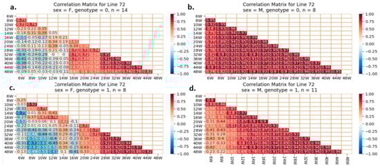 One of our proposed experiments was to evaluate if initial and BW gain correlate with adult weight in mice with or without the studied mutation. Pearson’s correlations quantify BW correlations and direction (increase or decrease). A value of +1 indicates a perfect positive relationship and correlation, −1 indicates a perfect negative one, and 0 indicates no relationship. Early and late body weights were correlated using heatmaps. Each line reflects mice’s weekly body weights. The fourth groups on each line are separate. Examples of heatmaps for lines IL72, IL3348, and IL6009 are shown below. The variations observed between different CC lines and within the same line are presented in Figure 12, Figure 13 and Figure 14.