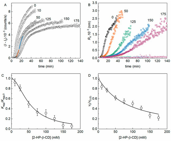 Figure 3C,D show the dependences of Rh on time for yADHp thermal aggregation in the absence and in the presence of 2-HP-β-CD (100 mM). These data also demonstrate the existence of two populations of aggregates in both cases (the population with larger Rh is designated with squares and the population with smaller Rh with circles of corresponding color for each protein concentration). It is interesting to note that the relative contribution of the smaller Rh population to the total light scattering intensity decreases faster in the absence of 2-HP-β-CD, especially at higher protein concentration. The second notable feature of the Rh(t) dependences is that the formation of aggregates with bigger Rh starts with sharp increase after the lag period in the presence of 2-HP-β-CD (see Figure 3D). These two facts should be taken into account for further discussion.