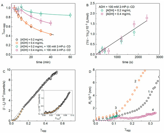 It is important to supply the light-scattering data with more thorough analysis by the methods giving the direct estimation of the portion of non-aggregated (γnon-agg) and aggregated (γagg) protein. The γnon-agg value was measured as described in Section 4.6. Figure 4A shows the dependences of γnon-agg (t) for various yADHp concentrations in the absence and in the presence of 100 mM 2-HP-β-CD. It was shown that the decrease in the γnon-agg over time did not depend on the protein concentration (Figure 4A, blue and orange circles), and the kinetic curves for ADH in the absence of 2-HP-β-CD did not differ from each other. This suggests the first order of aggregation with respect to the protein. In the presence of 2-HP-β-CD, the fraction of non-aggregated protein significantly increases, which confirms the suppression of aggregation.