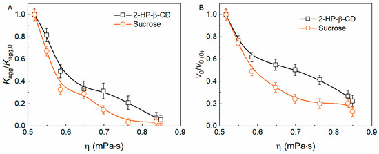One of the most obvious hypotheses about the mechanism of 2-HP-β-CD anti-aggregation activity is the hindering of particle diffusion and interaction by increased solution viscosity. Table S1 (Supplementary Materials) is illustrative of the dynamic viscosity (η) at different concentrations of 2-HP-β-CD. To test the effect of viscosity on yADHp aggregation we compared sucrose’s (Suc) effect on yADHp aggregation kinetics with the effect of 2-HP-β-CD. For this purpose, Suc concentrations with η values equal to those for different concentrations of 2-HP-β-CD (Table S2, Supplementary Materials) were used. The obtained kinetic curves of (I − I0) increase were analyzed as described in Section 2.1 and Section 2.3 using Equations (3) and (4). The dependences of the kinetic parameters Kagg/Kagg,0 and v0/v0(0) on the solution viscosity, η, are given in Figure 5A and Figure 5B, respectively.