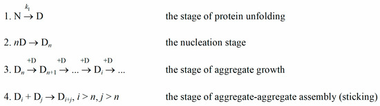 Protein aggregation is a natural but mostly undesirable process both in vivo and in vitro. Protein aggregates possess a higher light-scattering ability than original protein molecules. Therefore, light-scattering methods are widely used by experimenters to register the kinetics of protein aggregation. Analysis of the kinetic curves of aggregation can provide an understanding of the aggregation stages and changes in their rate under the influence of external factors. When modeling protein aggregation (Scheme 1), the initial stage usually is the stage of the protein molecule unfolding. The presence of a nucleation stage, i.e., the stage of assembling unfolded protein molecules into larger structures (nuclei), is evidenced by the appearance of a concentration-dependent lag phase on the kinetic curves [1,2,3]. The part of the kinetic curve after the lag phase describes the stage of aggregate growth, which is realized by the attachment of unfolded protein molecules to existing nuclei or aggregates. In some cases, there could also be the further stage of aggregate–aggregate sticking [4].
