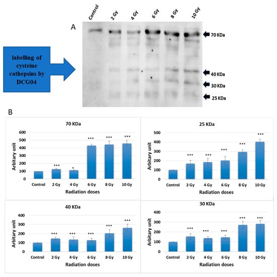 Caco-2 cells were subjected to increasing doses of ionizing irradiation followed by treatment with DCG-04, an activity-based probe designed for papain family cysteine caths. DCG-04 contains an epoxide warhead that selectively and irreversibly interacts with the active site cysteine residue of targeted cysteine caths, facilitating the study of their specific activities rather than their abundance. After cell harvesting, SDS-PAGE under reducing conditions was performed to visualize DCG-04 labelled cysteine peptidases using streptavidin-HRP. Four major bands with molecular weights of 70, 40, 30, and 25 KDa were observed (