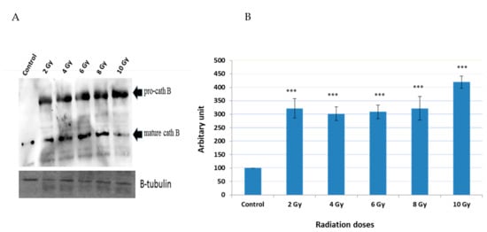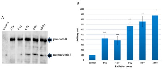 Notably, the upregulation of cath B was observed in both its pro-cath B and processed/mature forms. However, in contrast to the total cath B levels, the mature cath B was less abundant at the 10 Gy irradiation compared to the smaller doses.