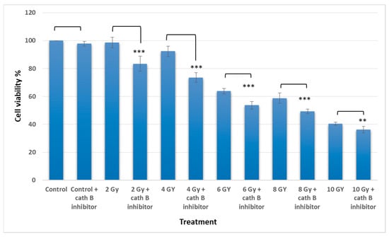 Similarly, at 6 Gy, the cytotoxic effect of ionizing radiation was more pronounced, resulting in a cell viability of approximately 64% without cath B inhibitor and 55% after cath B inhibition. At 8 Gy, cell viability was inhibited to 58% in the absence of the cath B inhibitor and 49% in its presence. Finally, at 10 Gy, cell viability was reduced to 40% without cath B inhibition and 36% after cath B inhibition. However, no significant differences were observed between the two control groups.