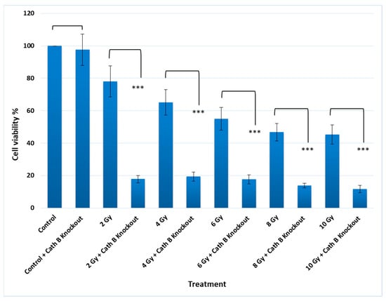 p < 0.001). At 2 Gy, Cath B exhibited approximately a four-fold upregulation, while at 8 Gy, it was upregulated by over seven-fold. At the highest tested dose of 10 Gy, Cath B showed a nearly nine-fold upregulation (