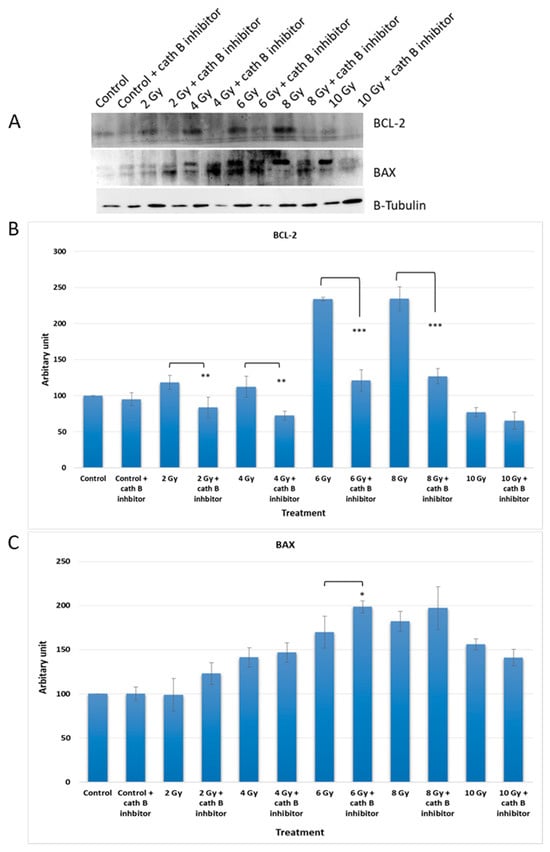Regarding the pro-apoptotic protein BAX, its expression increased by about 25% at 2 Gy and 6 Gy doses. However, the effect was less pronounced at 4 Gy and 8 Gy doses, although the difference was still statistically significant. Remarkably, at 10 Gy, BAX expression was slightly reduced in cells treated with cath B inhibitor in comparison with cells exposed only to ionizing radiation.