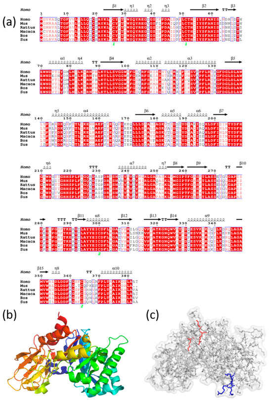CHI3L1 (chitin-3-like 1), also known as YKL-40 in humans, is a member of the 18-glycoside hydrolase family composed of 383 amino acids. CHI3L1 has a molecular weight of 40 KDa and no hydrolase activity due to mutations in two critical active residues, but it retains a high affinity for chitin. A comparison of CHI3L1 sequences from different species shows a high degree of conservation (shown in Figure 1a). This indicates that studying the physiological functions and activities of CHI3L1 in animals can be strongly correlated with relevant physiological activities in humans, which has significant clinical research significance.