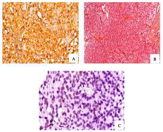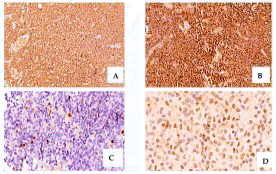 The histopathological diagnosis was established after routine staining with hematoxylin and eosin (H&E) on 3 µm sections for each case. The quality of the specimens was verified using immunostaining with vimentin (ETU Leica, clone V9, RTU). Morphological staining was performed using a Leica Autostainer XL (Leica Biosystem Newcastle Ltd., Balliol Business Park West, Benton Lane, New Castle Upon Tyne, NE 12 EW, UK). Microscopic examination was performed with a Nikon Eclipse E 600 microscope (Nikon Corporation, Tokyo, Japan). Antibodies used were from Dako Cytomation, Agilent, Santa Clara, CA, USA and Thermo Fisher Scientific, Waltham, MA, USA.