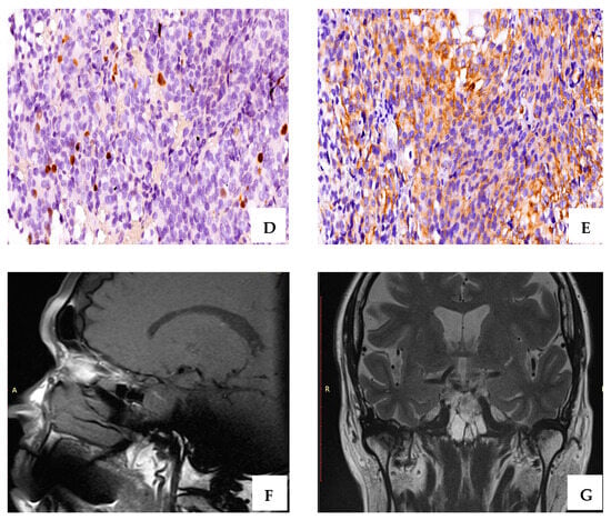 A case of resistant PRL-secreting PitNET with intense positive IHC staining for PRL (A), (×40 magnification); Cromophobe and acidophil tinctoriality, H&E staining (B) (×20 magnification); ER∝ intense positive (C) (+3, ×60 magnification); CAM 5.2, densely granulated pattern (D) (×40 magnification); ki-67 of 6% (E) (×20 magnification); T2-weighted magnetic resonance image sagittal plane—pituitary macroadenoma: 11/10/11 mm (postoperative) (F); T2-weighted magnetic resonance image coronal plane—pituitary macroadenoma (postoperative) (G).