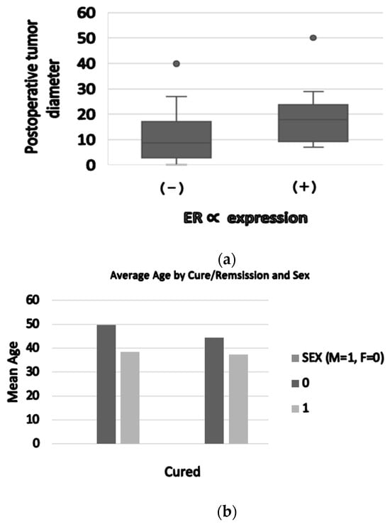 (a) ER∝ expression (positive/negative) was correlated with maximal postoperative tumor diameter (31.3 ± 19.4 mm versus 20 ± 9.7 mm, p = 0.03). (b) Average age by sex: female patients had a higher age compared to males (49 years old versus 37.8 years old). Patients not cured after surgery had an average age of 45.5 years old.