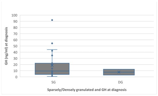 Preoperative GH level associated with the granulation pattern. The sparsely granulated pattern had a higher GH level than the densely granulated (18.2 ng/mL versus 7.6 ng/mL, p = 0.51).
