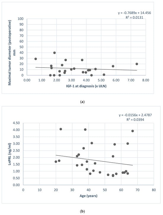 (a) IGF1 at diagnosis and postoperative maximal tumor diameter association. (b) Serum prolactin concentration (ln) and patients’ age.