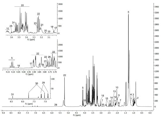 Using the NOESY, CPMG, J-Res, HMBC and HSQC pulse sequences, 31 metabolites/signals were identified (Table S1). A custom R code allowed the integration of isolated peaks of different metabolites from CPMG spectra (Figure 1).