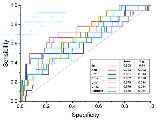 The discriminatory power of stroke risk for the seven metabolites that showed significant differences between the study groups was estimated from the analysis of the area under the receiver operating characteristic curve (AUROC; sensitivity/specificity), using the relative concentrations obtained in univariate analysis. Asn (p = 0.002) presented an AUROC above 0.7. Cre (p = 0.013), while Dms (p = 0.026), Unk1 (p = 0.679) and Unk3 (p = 0.679) had an AUROC between 0.65 and 0.70. Ile (p = 0.140) and formate (p = 0.064) had an AUROC below 0.65 and a non-significant p value, indicating lower discriminatory power for stroke risk (Figure 3). Thus, these data indicate good performance with good AUROC parameters for Asn, Cre, Dms, Ukn1 and Ukn3 (Figure 3). The information provided by other authors, regarding several of these metabolites as possible biomarkers of stroke (isoleucine, asparagine, creatinine, and formate), has been included in Table S3.
