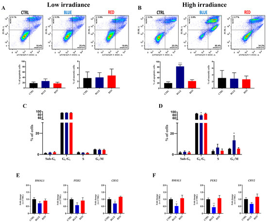 Since alteration in the circadian clock gene expression in human cells was correlated with cell cycle dysfunction and induction of apoptosis [26], we investigated the expression of BMAL1, PER2 and CRY2 clock genes. Low-irradiance blue light was able to induce a significant downregulation of the CRY2 clock gene expression level compared with the CTRL (Figure 2E). In addition, HaCaT cells treated with high-irradiance blue light showed a significant downregulation of the BMAL1 and PER2 clock gene levels compared with the CTRL (Figure 2F).